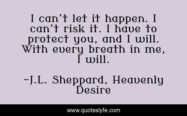This page presents the quote "I can’t let it happen. I can’t risk it. I have to protect you, and I will. With every breath in me, I will.". Author of this quote is J.L. Sheppard, Heavenly Desire. This quote is about paranormal-series, fantasy-series, fantasy, faeries, romance-series, paranormal, demons, romance, werewolves,.