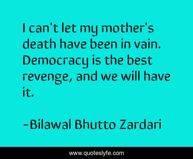 This page presents the quote "I can't let my mother's death have been in vain. Democracy is the best revenge, and we will have it.". Author of this quote is Bilawal Bhutto Zardari. This quote is about revenge, best, mother,.