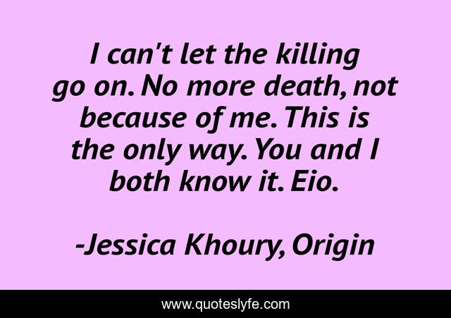 This page presents the quote "I can't let the killing go on. No more death, not because of me. This is the only way. You and I both know it. Eio.". Author of this quote is Jessica Khoury, Origin. This quote is about sacrifice, death, love, affection, killing,.