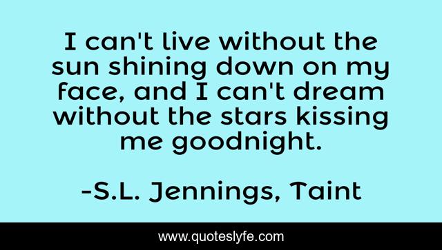 This page presents the quote "I can't live without the sun shining down on my face, and I can't dream without the stars kissing me goodnight.". Author of this quote is S.L. Jennings, Taint. This quote is about love, justice-drake, taint, drake, s-l-jennings, ally, affection,.