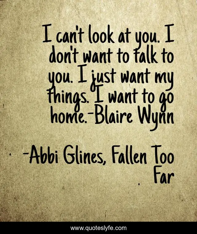 This page presents the quote "I can't look at you. I don't want to talk to you. I just want my things. I want to go home.-Blaire Wynn". Author of this quote is Abbi Glines, Fallen Too Far. This quote is about love, young-adult-romance, affection, hurt,.