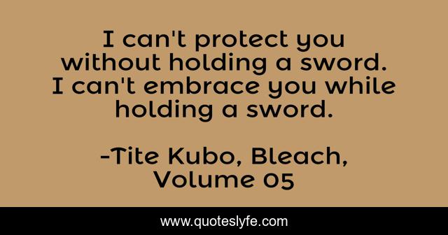 This page presents the quote "I can't protect you without holding a sword. I can't embrace you while holding a sword.". Author of this quote is Tite Kubo, Bleach, Volume 05. This quote is about letting-go, protection, love, affection,.