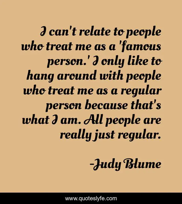 This page presents the quote "I can't relate to people who treat me as a 'famous person.' I only like to hang around with people who treat me as a regular person because that's what I am. All people are really just regular.". Author of this quote is Judy Blume. This quote is about me, treat,.