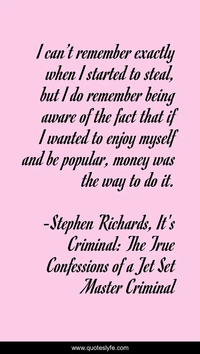 This page presents the quote "I can’t remember exactly when I started to steal, but I do remember being aware of the fact that if I wanted to enjoy myself and be popular, money was the way to do it.". Author of this quote is Stephen Richards, It's Criminal: The True Confessions of a Jet Set Master Criminal. This quote is about bank-robber, money, scottish-crime, james-crosbie, crime,.