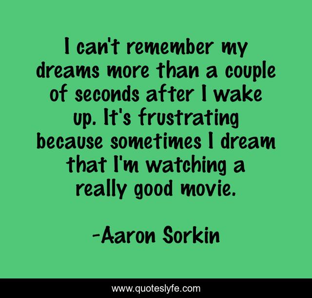 This page presents the quote "I can't remember my dreams more than a couple of seconds after I wake up. It's frustrating because sometimes I dream that I'm watching a really good movie.". Author of this quote is Aaron Sorkin. This quote is about wake up, good, remember,.