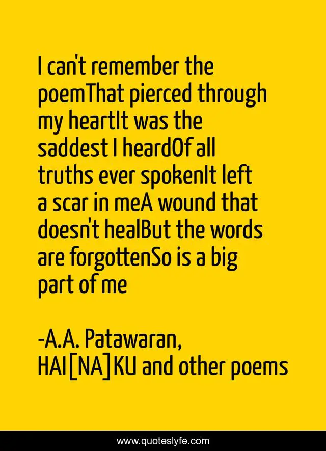This page presents the quote "I can't remember the poemThat pierced through my heartIt was the saddest I heardOf all truths ever spokenIt left a scar in meA wound that doesn't healBut the words are forgottenSo is a big part of me". Author of this quote is A.A. Patawaran, HAI[NA]KU and other poems. This quote is about reading, poetry,.