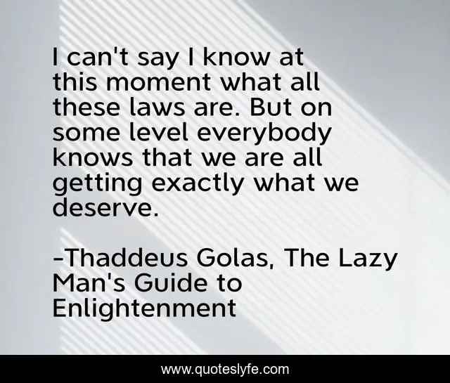 This page presents the quote "I can't say I know at this moment what all these laws are. But on some level everybody knows that we are all getting exactly what we deserve.". Author of this quote is Thaddeus Golas, The Lazy Man's Guide to Enlightenment. This quote is about self-awareness, justice, deserve, merit, universe, law, cause-and-effect,.