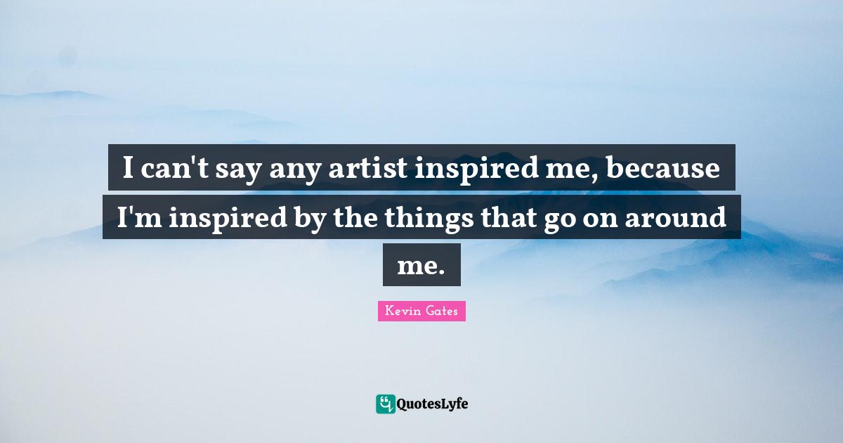This page presents the quote "I can't say any artist inspired me, because I'm inspired by the things that go on around me.". Author of this quote is Kevin Gates. This quote is about i can, inspired, goes on, artist,.