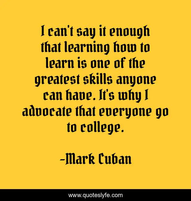 This page presents the quote "I can't say it enough that learning how to learn is one of the greatest skills anyone can have. It's why I advocate that everyone go to college.". Author of this quote is Mark Cuban. This quote is about college, greatest, why,.
