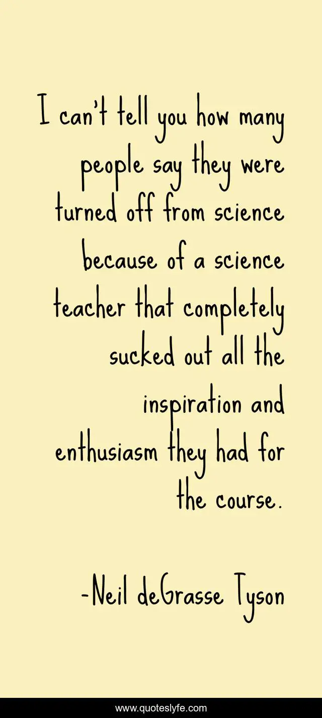 This page presents the quote "I can't tell you how many people say they were turned off from science because of a science teacher that completely sucked out all the inspiration and enthusiasm they had for the course.". Author of this quote is Neil deGrasse Tyson. This quote is about science, people,.