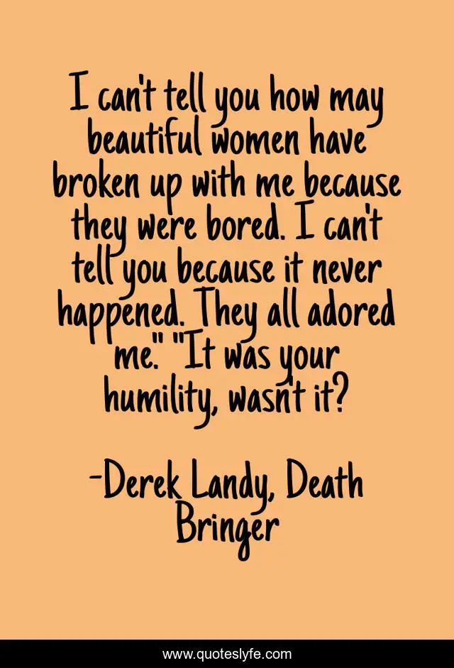 This page presents the quote "I can't tell you how may beautiful women have broken up with me because they were bored. I can't tell you because it never happened. They all adored me." "It was your humility, wasn't it?". Author of this quote is Derek Landy, Death Bringer. This quote is about make-me-laugh, clever, brilliant, awesome, witty, hilarious, epic,.