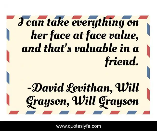 This page presents the quote "I can take everything on her face at face value, and that's valuable in a friend.". Author of this quote is David Levithan, Will Grayson, Will Grayson. This quote is about friendship, honesty, relationship,.