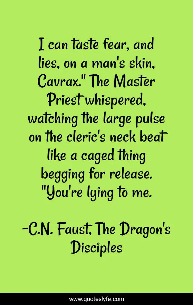 This page presents the quote "I can taste fear, and lies, on a man's skin, Cavrax." The Master Priest whispered, watching the large pulse on the cleric's neck beat like a caged thing begging for release. "You're lying to me.". Author of this quote is C.N. Faust, The Dragon's Disciples. This quote is about novel, gods, vampire, paranormal, priest, supernatural, writing, dragon,.