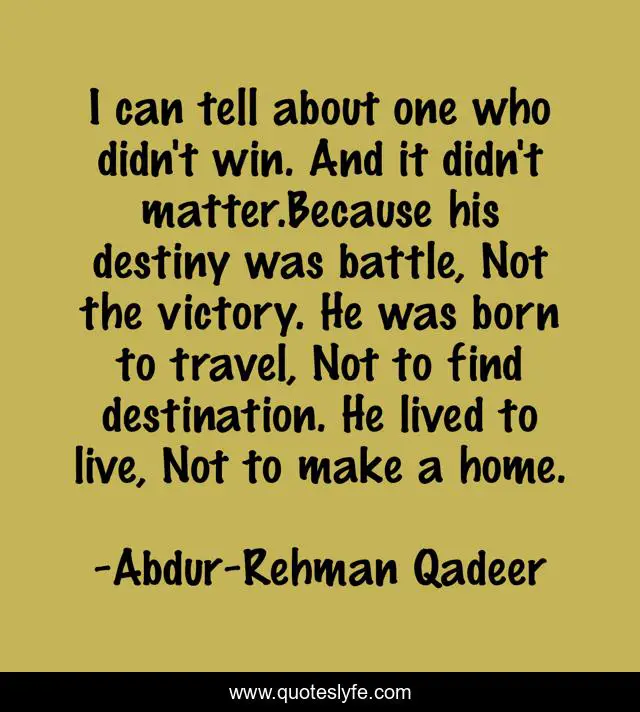 This page presents the quote "I can tell about one who didn't win. And it didn't matter.Because his destiny was battle, Not the victory. He was born to travel, Not to find destination. He lived to live, Not to make a home.". Author of this quote is Abdur-Rehman Qadeer. This quote is about arq, life, motivational, warrior, positive, travel, destination, confidence, victory,.