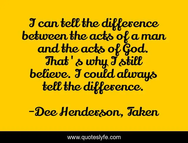 This page presents the quote "I can tell the difference between the acts of a man and the acts of God. That's why I still believe. I could always tell the difference.". Author of this quote is Dee Henderson, Taken. This quote is about christian, inspiration,.