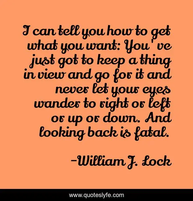 This page presents the quote "I can tell you how to get what you want: You've just got to keep a thing in view and go for it and never let your eyes wander to right or left or up or down. And looking back is fatal.". Author of this quote is William J. Lock. .