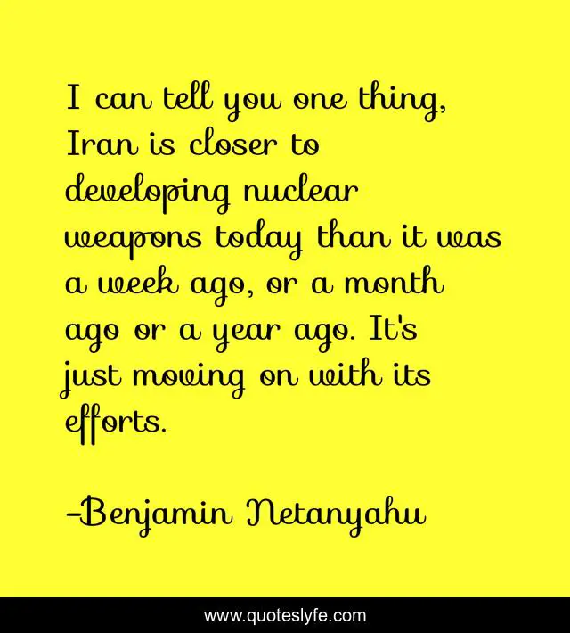 This page presents the quote "I can tell you one thing, Iran is closer to developing nuclear weapons today than it was a week ago, or a month ago or a year ago. It's just moving on with its efforts.". Author of this quote is Benjamin Netanyahu. This quote is about week, moving, today,.
