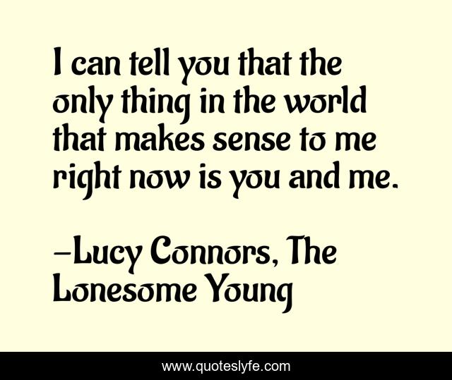 This page presents the quote "I can tell you that the only thing in the world that makes sense to me right now is you and me.". Author of this quote is Lucy Connors, The Lonesome Young. This quote is about romance, victoria-whitfield, mickey-rhodale, young-adult,.