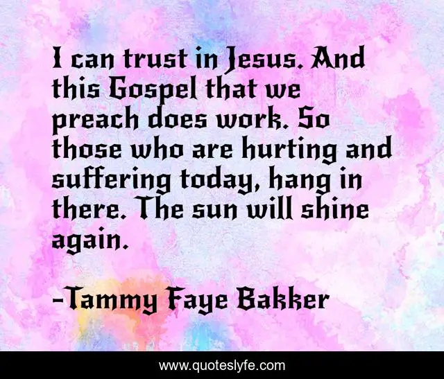 This page presents the quote "I can trust in Jesus. And this Gospel that we preach does work. So those who are hurting and suffering today, hang in there. The sun will shine again.". Author of this quote is Tammy Faye Bakker. This quote is about sun, work, today,.