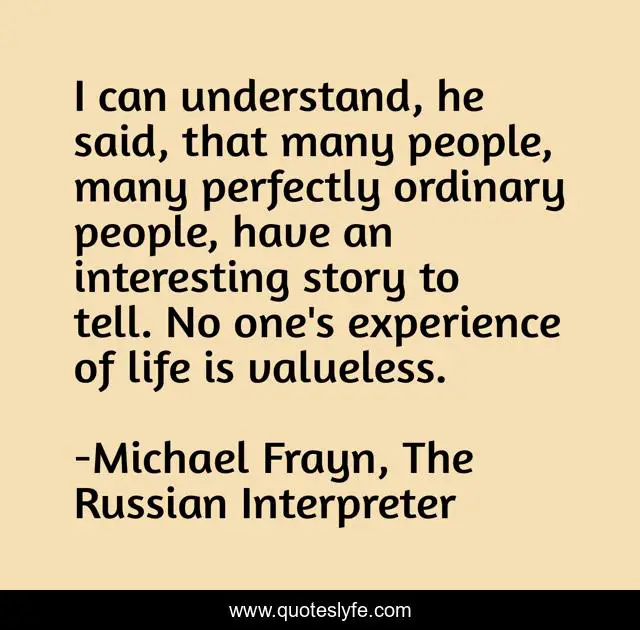 This page presents the quote "I can understand, he said, that many people, many perfectly ordinary people, have an interesting story to tell. No one's experience of life is valueless.". Author of this quote is Michael Frayn, The Russian Interpreter. This quote is about experiences, life-stories, truths, reality-of-life,.