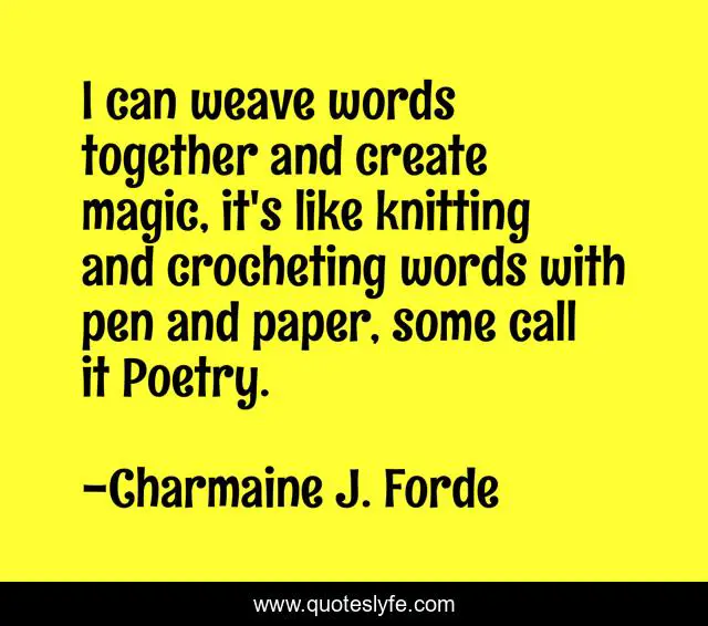 This page presents the quote "I can weave words together and create magic, it's like knitting and crocheting words with pen and paper, some call it Poetry.". Author of this quote is Charmaine J. Forde. This quote is about knitting, magic, poetry, crochet,.