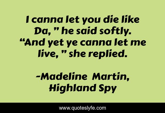 This page presents the quote "I canna let you die like Da, ” he said softly. “And yet ye canna let me live, ” she replied.". Author of this quote is Madeline Martin, Highland Spy. This quote is about mystery, scottish, historical, spies,.