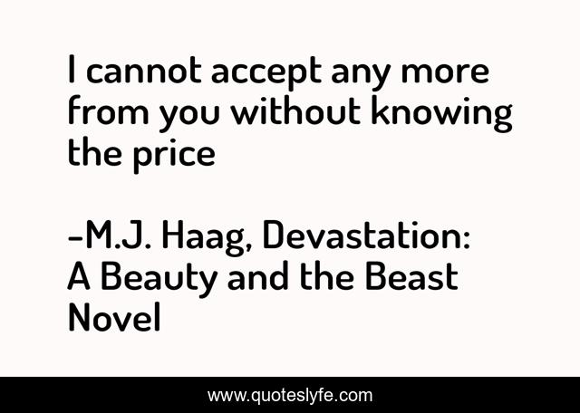 This page presents the quote "I cannot accept any more from you without knowing the price". Author of this quote is M.J. Haag, Devastation: A Beauty and the Beast Novel. This quote is about price, healing,.