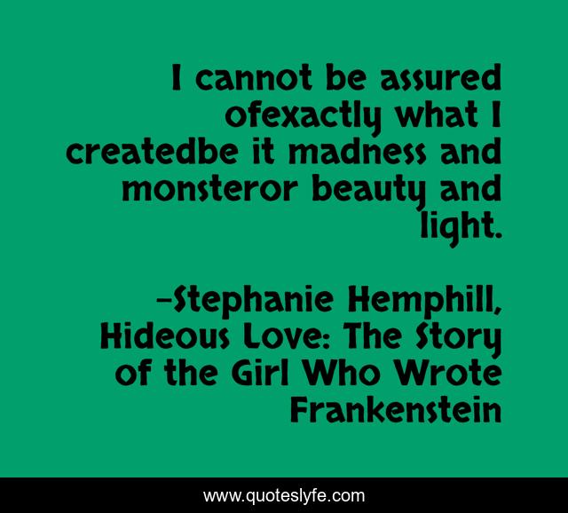 This page presents the quote "I cannot be assured ofexactly what I createdbe it madness and monsteror beauty and light.". Author of this quote is Stephanie Hemphill, Hideous Love: The Story of the Girl Who Wrote Frankenstein. .