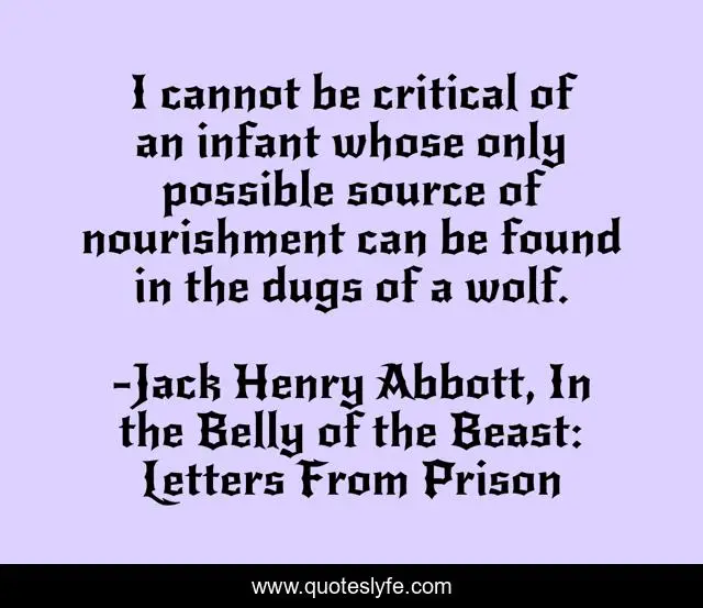 This page presents the quote "I cannot be critical of an infant whose only possible source of nourishment can be found in the dugs of a wolf.". Author of this quote is Jack Henry Abbott, In the Belly of the Beast: Letters From Prison. .