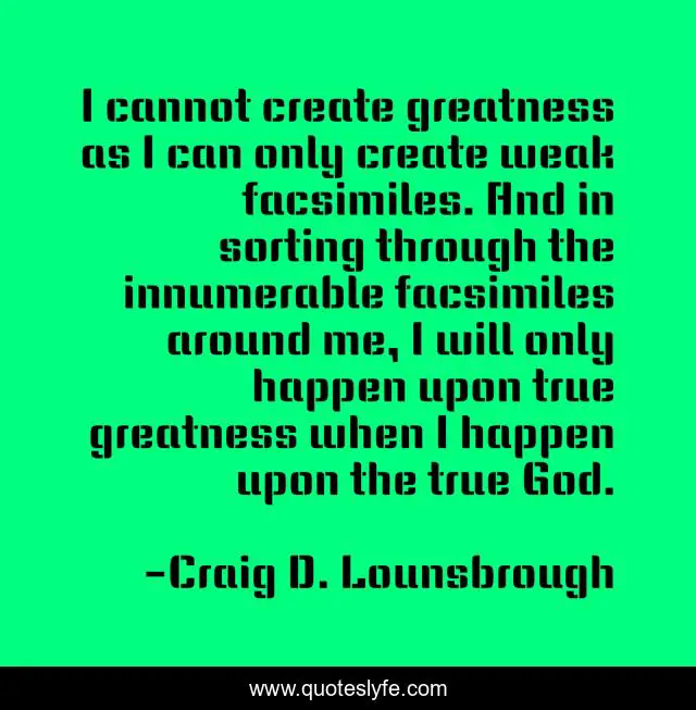This page presents the quote "I cannot create greatness as I can only create weak facsimiles. And in sorting through the innumerable facsimiles around me, I will only happen upon true greatness when I happen upon the true God.". Author of this quote is Craig D. Lounsbrough. This quote is about great, bible, christian, god, fake, facsimiles, christianity, fraudulent, greatness,.