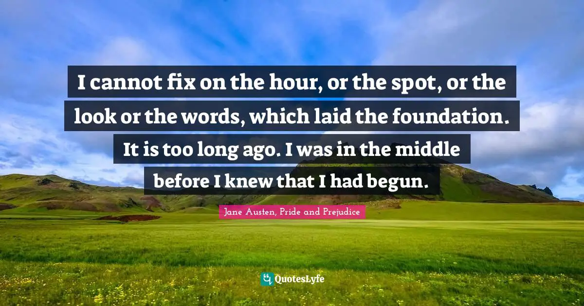 This page presents the quote "I cannot fix on the hour, or the spot, or the look or the words, which laid the foundation. It is too long ago. I was in the middle before I knew that I had begun.". Author of this quote is Jane Austen, Pride and Prejudice. This quote is about romance, love, affection,.