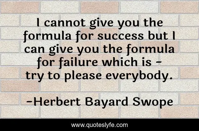 This page presents the quote "I cannot give you the formula for success but I can give you the formula for failure which is - try to please everybody.". Author of this quote is Herbert Bayard Swope. .