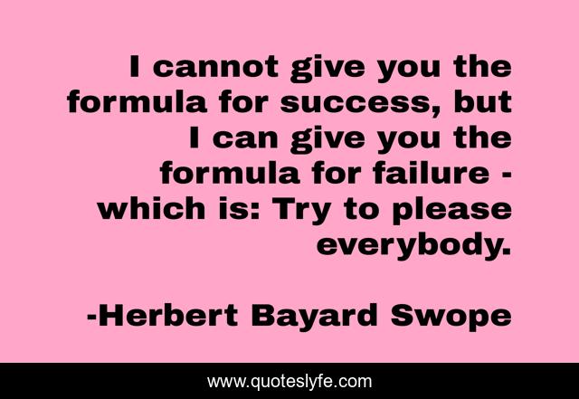 This page presents the quote "I cannot give you the formula for success, but I can give you the formula for failure - which is: Try to please everybody.". Author of this quote is Herbert Bayard Swope. This quote is about try, success,.