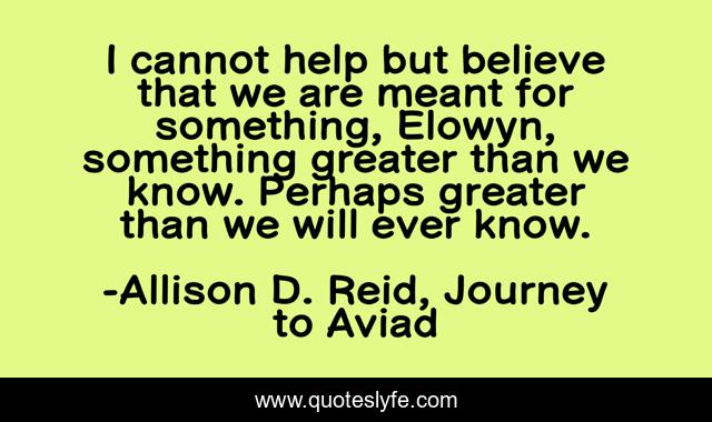 This page presents the quote "I cannot help but believe that we are meant for something, Elowyn, something greater than we know. Perhaps greater than we will ever know.". Author of this quote is Allison D. Reid, Journey to Aviad. This quote is about enthusiasm, christian-life, book, inspirational,.