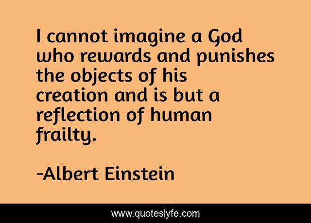 This page presents the quote "I cannot imagine a God who rewards and punishes the objects of his creation and is but a reflection of human frailty.". Author of this quote is Albert Einstein. This quote is about god, reflection, human,.