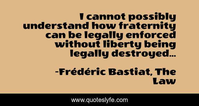 This page presents the quote "I cannot possibly understand how fraternity can be legally enforced without liberty being legally destroyed...". Author of this quote is Frédéric Bastiat, The Law. This quote is about law, fraternity, liberty,.