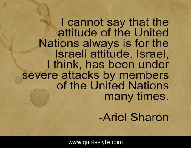 This page presents the quote "I cannot say that the attitude of the United Nations always is for the Israeli attitude. Israel, I think, has been under severe attacks by members of the United Nations many times.". Author of this quote is Ariel Sharon. This quote is about think, united nations,.