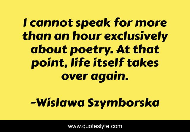 This page presents the quote "I cannot speak for more than an hour exclusively about poetry. At that point, life itself takes over again.". Author of this quote is Wislawa Szymborska. This quote is about life, speak, point,.