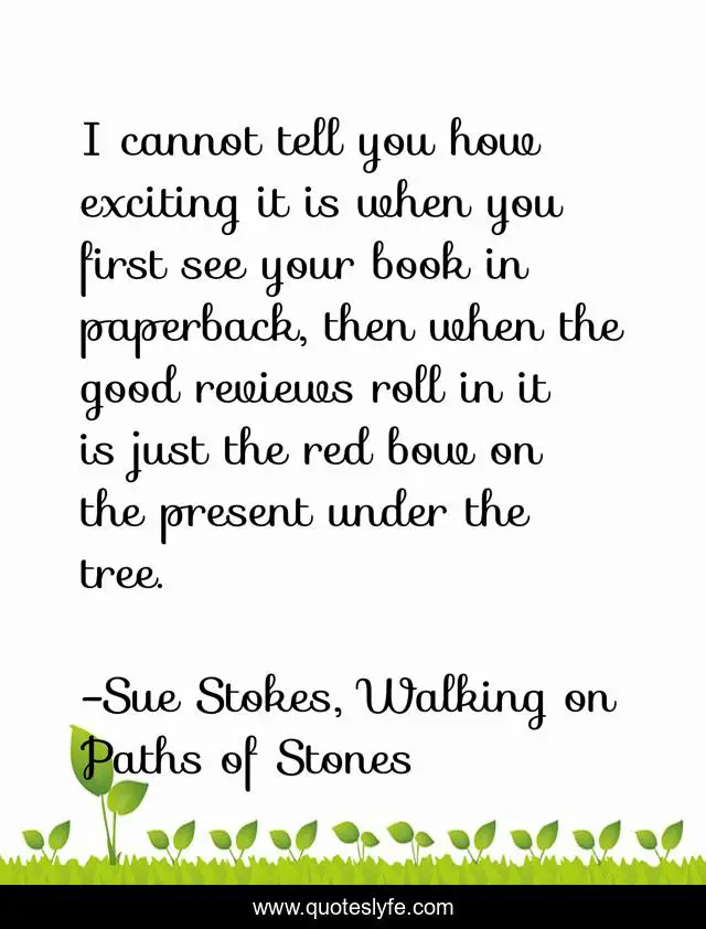 This page presents the quote "I cannot tell you how exciting it is when you first see your book in paperback, then when the good reviews roll in it is just the red bow on the present under the tree.". Author of this quote is Sue Stokes, Walking on Paths of Stones. .