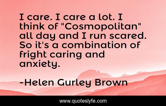 This page presents the quote "I care. I care a lot. I think of "Cosmopolitan" all day and I run scared. So it's a combination of fright caring and anxiety.". Author of this quote is Helen Gurley Brown. This quote is about future, anxiety,.