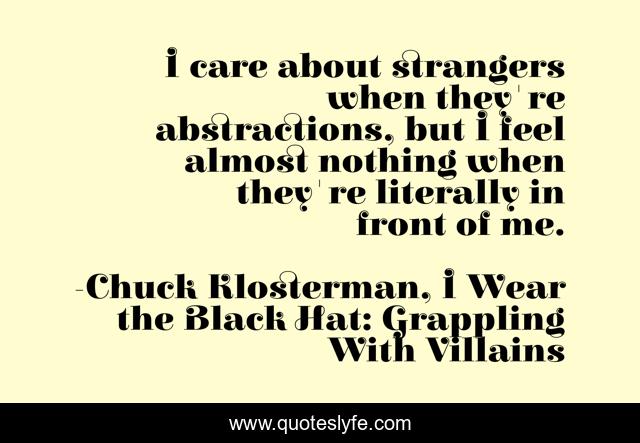 This page presents the quote "I care about strangers when they're abstractions, but I feel almost nothing when they're literally in front of me.". Author of this quote is Chuck Klosterman, I Wear the Black Hat: Grappling With Villains. This quote is about abstractions, i, they-re, chuck, strangers, black, wear, klosterman, hat,.