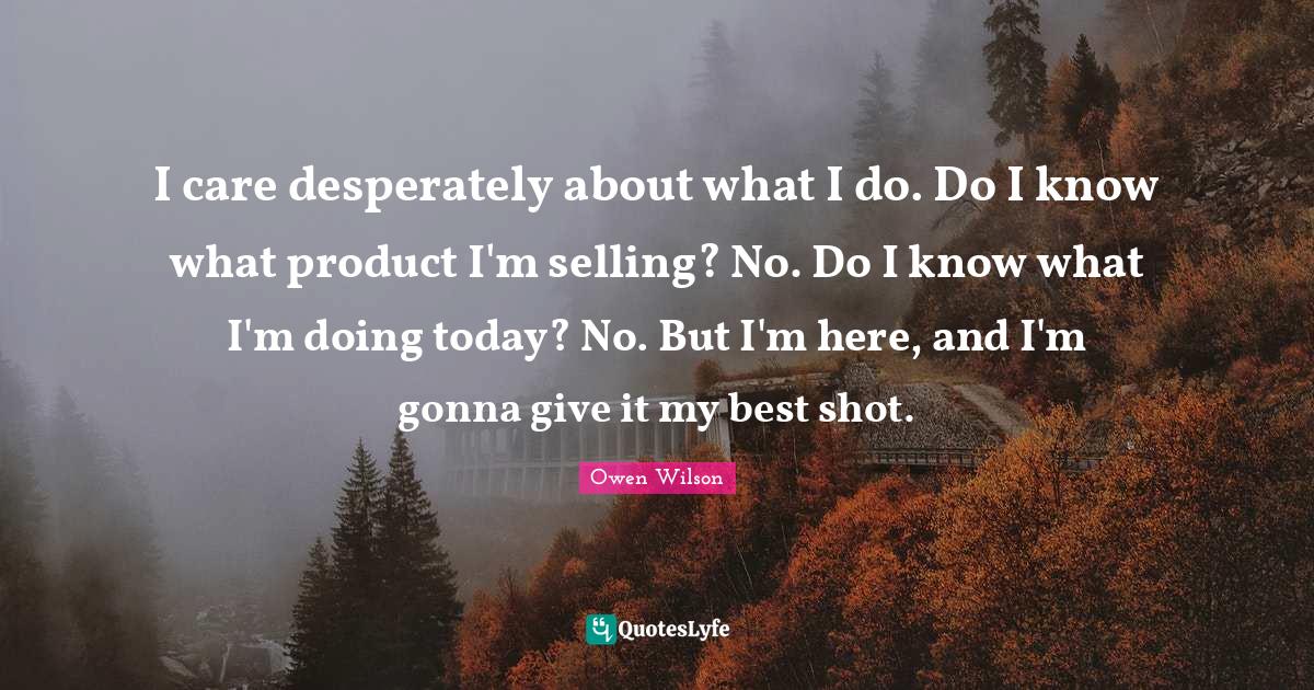 This page presents the quote "I care desperately about what I do. Do I know what product I'm selling? No. Do I know what I'm doing today? No. But I'm here, and I'm gonna give it my best shot.". Author of this quote is Owen Wilson. This quote is about today, selling, best shot, i care, care, giving,.