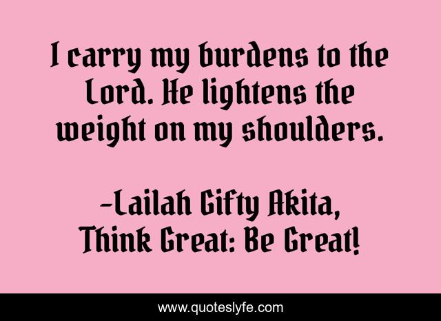 "Lailah Gifty Akita, Think Great: Be Great! Quotes." Quoteslyfe.com, 2025. Mon. 08 Dec. 2025. <https://www.quoteslyfe.com/quote/I-carry-my-burdens-to-the-Lord-78356>.