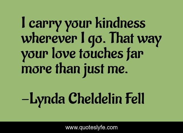 This page presents the quote "I carry your kindness wherever I go. That way your love touches far more than just me.". Author of this quote is Lynda Cheldelin Fell. .