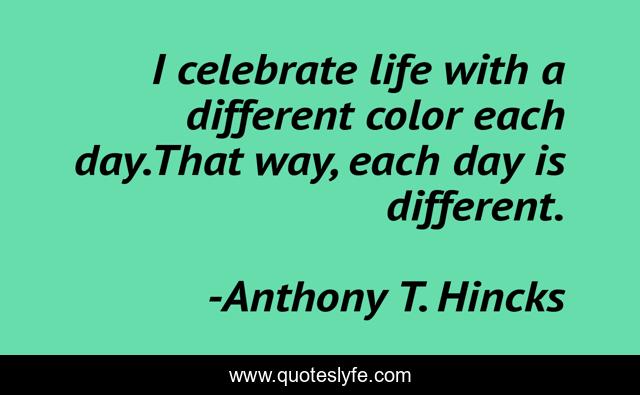 This page presents the quote "I celebrate life with a different color each day.That way, each day is different.". Author of this quote is Anthony T. Hincks. This quote is about life, color, colour, philosophy, different, day, celebrate,.