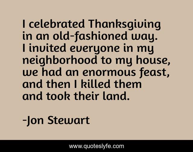 This page presents the quote "I celebrated Thanksgiving in an old-fashioned way. I invited everyone in my neighborhood to my house, we had an enormous feast, and then I killed them and took their land.". Author of this quote is Jon Stewart. This quote is about humor, absurd, thanksgiving,.