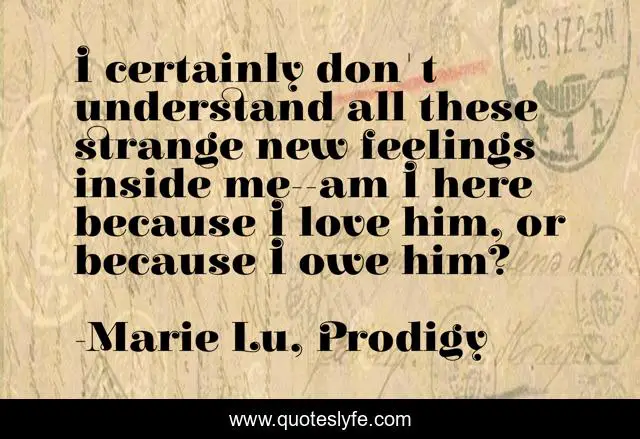 This page presents the quote "I certainly don't understand all these strange new feelings inside me--am I here because I love him, or because I owe him?". Author of this quote is Marie Lu, Prodigy. This quote is about june, love, day, affection,.