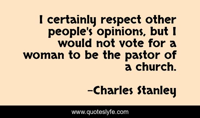This page presents the quote "I certainly respect other people's opinions, but I would not vote for a woman to be the pastor of a church.". Author of this quote is Charles Stanley. This quote is about opinions, woman, people,.