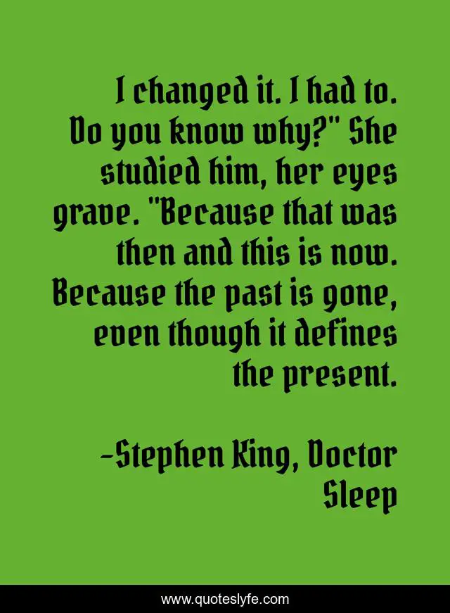This page presents the quote "I changed it. I had to. Do you know why?" She studied him, her eyes grave. "Because that was then and this is now. Because the past is gone, even though it defines the present.". Author of this quote is Stephen King, Doctor Sleep. This quote is about past, stephen-king, doctor-sleep, change, present,.