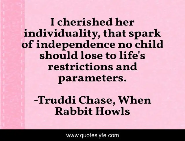 This page presents the quote "I cherished her individuality, that spark of independence no child should lose to life's restrictions and parameters.". Author of this quote is Truddi Chase, When Rabbit Howls. This quote is about youth, individuality, independence, innocence,.